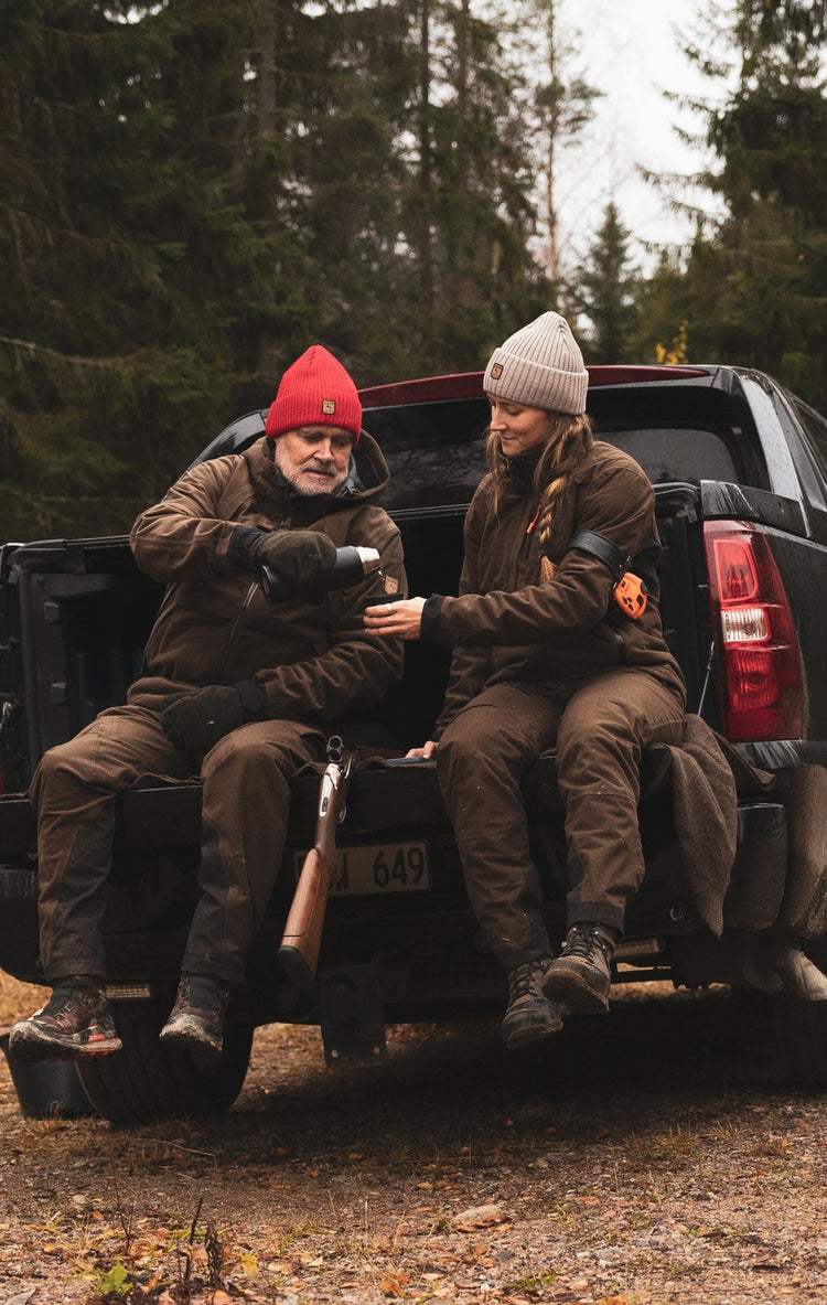 Wool, as a natural material, is well suited for hunting outfits. Wool is a breathable material with excellent thermal insulation properties. It regulates body temperature, making it well suited for both cold and warm weather. Wool absorbs and transfers moisture effectively, without ever feeling wet. Wool has natural water- and dirt-repelling properties, and it is easy to keep clean by airing, and it is very silent. A small amount of either polyester or polyamide has been added to the wool to provide strength, improving wear resistance, without compromising the natural performance of wool.